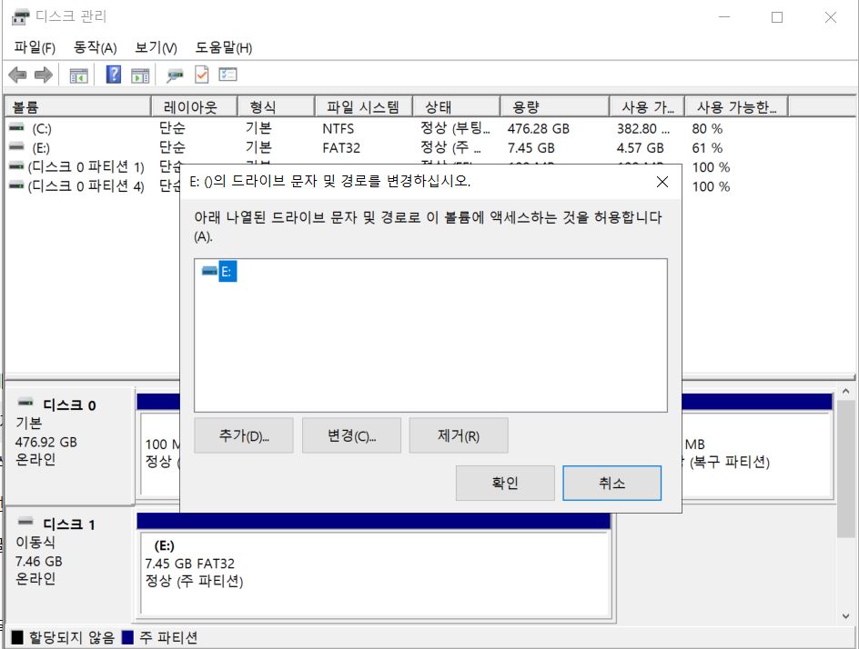 → 우클릭 → 드라이브 문자 및 경로 변경