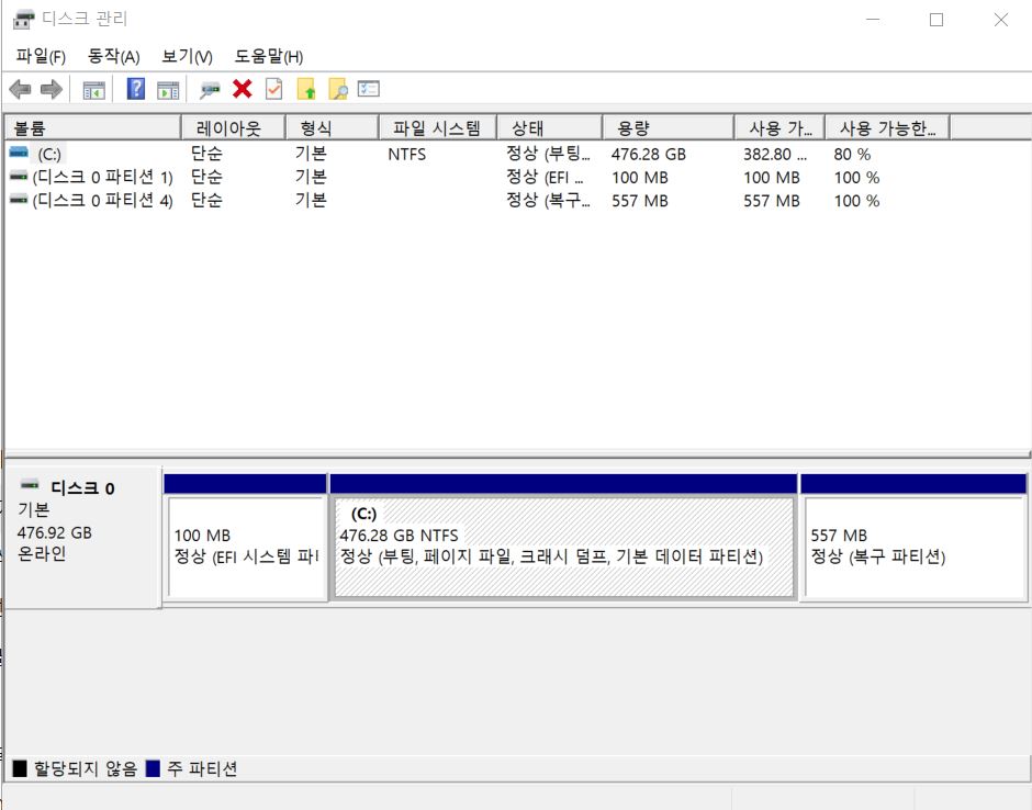 - 시작 메뉴 우클릭 → 디스크 관리
